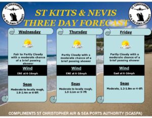 Weather Forecast for St. Kitts & Nevis: A moderate breeze will continue over the Leeward Islands and their coastal waters tonight and tomorrow. Whereas shallow cloud patches would be transported over these islands at times, the chance of showers will