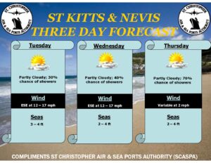 Weather Forecast for St. Kitts & Nevis: Weather today: Partly sunny with a 40 percent or moderate chance of brief afternoon showers.