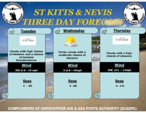 Weather Forecast for St. Kitts & Nevis: A moderate to fresh trade wind flow generated by a relatively strong Atlantic high pressure system will continue to transport pockets of low level moisture across the area, which could lead to a moderate chance for shower activity over and around the islands during the next 24 hours.