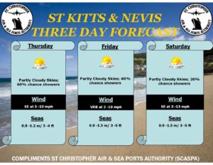 Weather Forecast for St. Kitts & Nevis: Partly Cloudy with a 60% or moderate chance of showers during the morning and partly sunny with 30% or low chance of showers in the afternoon.