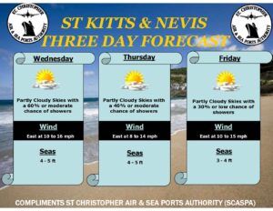 Weather Forecast for St. Kitts and Nevis: A weak line of moisture will sweep across the area and marginally increase the chances for shower activity over and around the islands overnight into early tomorrow. Dry and stable conditions will once again dominate thereafter.