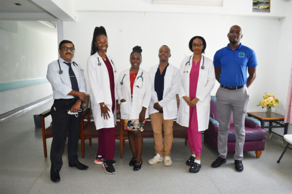 1: R-L:  Dr Jenson Morton; Ms Kaedida Fough, 3rd year medicine student; Mr Rashumba Gilbert, 5th year medicine student; Ms Yaruska Irish, 5th year medicine student; Ms Dolicia Barry, 3rd year medicine student; and Dr Suresh Chinnaswamy, Internist at JNF Hospital.