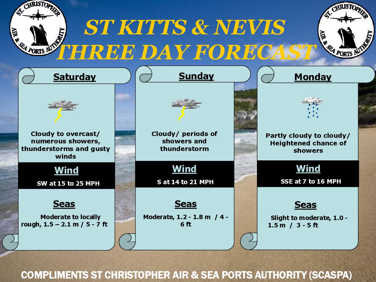 between 50 to 75mm or 2 to 3 inches during the forecast period. Therefore, skies over St.Kitts and Nevis will be cloudy to overcast with period of showers, some of which will be moderate to heavy at times accompanied by widespread thunderstorms and strong gusty winds. Tomorrow will be cloudy to overcast with numerous showers, some of which will be moderate to heavy at times accompanied by widespread thunderstorms and strong gusty winds.