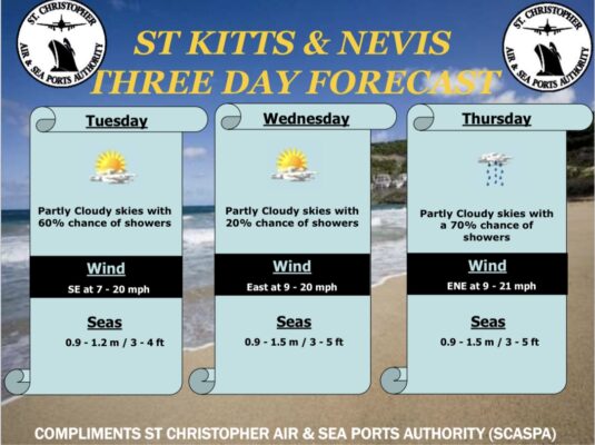 Forecast for St. Kitts and Nevis: Generally stable conditions are likely overnight as a relatively dry and stable airmass moves over the area. However, the chances of showers are expected to increase tomorrow as a weak tropical wave moves over the Leewards and British Virgin Islands.