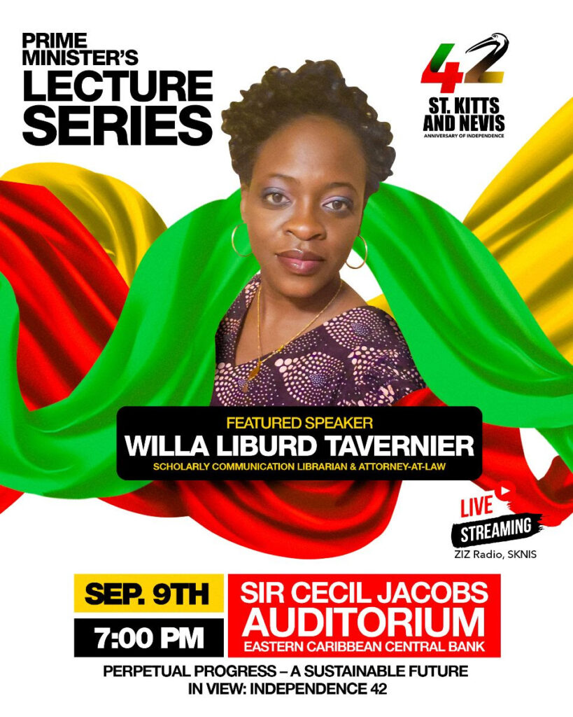 Basseterre, Saint Kitts – The Organising Committee for the 42nd Anniversary of Independence is proud to announce that Ms. Willa Liburd Tavernier, a distinguished attorney-at-law, academic librarian and global advocate for equitable knowledge access, will be the featured speaker for the 27th Prime Minister’s Lecture Series.
