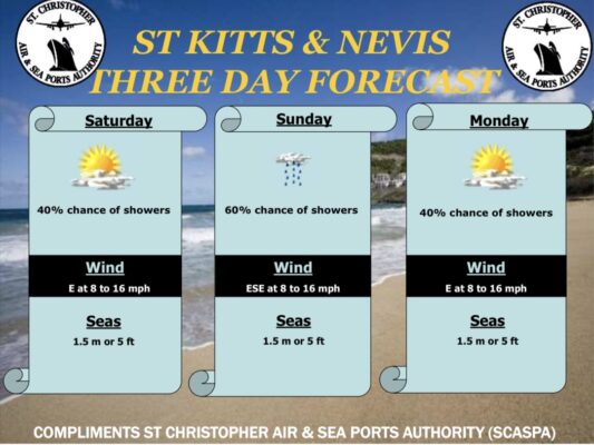 Forecast for St. Kitts and Nevis: Available moisture and weak instability could trigger brief and light shower activity over and around the islands.