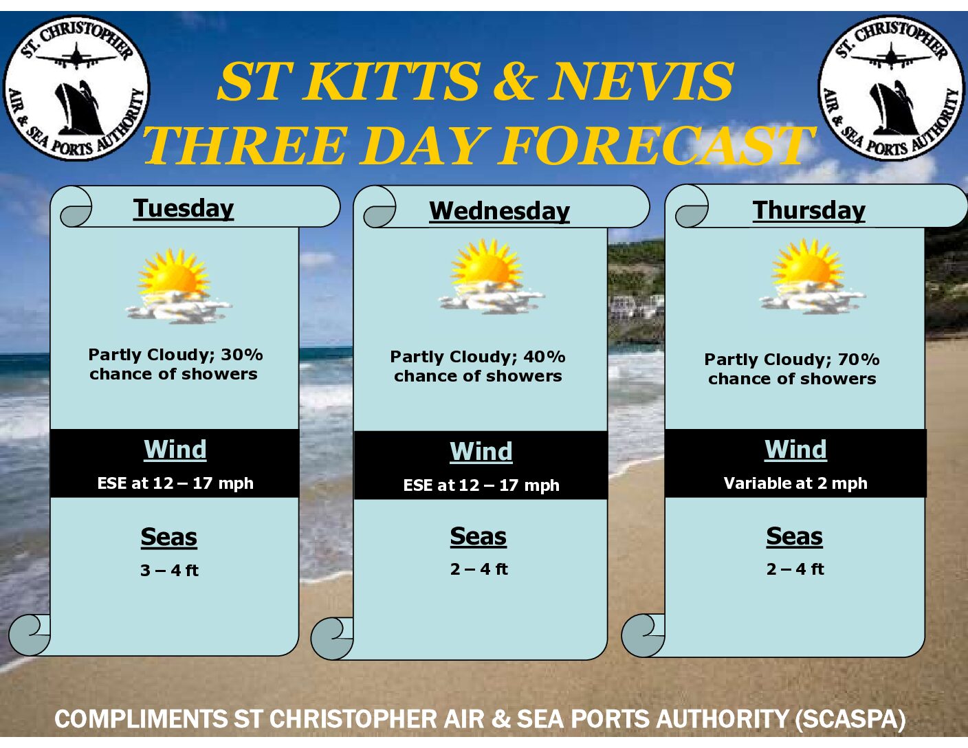 Forecast for St. Kitts and Nevis: Dry and stable air due to the presence of high pressure will continue to limit shower activity across the region.