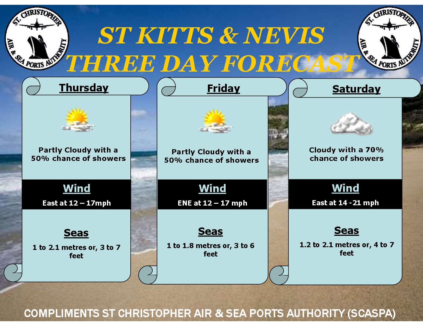 Weather Forecast for St. Kitts & Nevis: Some shallow moisture and instability preceding a weak trough northeast of the region could generate some brief showers across the islands.