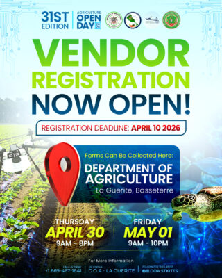 The Department of Agriculture, St. Kitts, is inviting all vendors, farmers, fishers, agro-processors, agri-preneurs, businesses, and other stakeholders to register early for the 31st edition of the Agriculture Open Day, slated for Thursday, April 30 and Friday, May 1 2026.